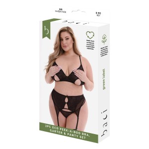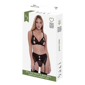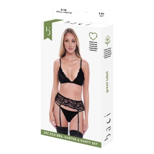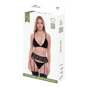The Baci ECO Bra, Panty, and Garter Set in black is a seductive, sustainable trio that’s sure to cap..