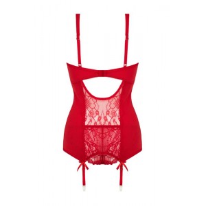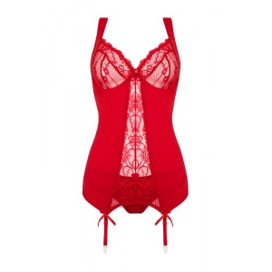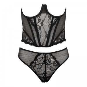 This set consists of a corset with suspenders and matching lace panties. The corset has lace cups wi..