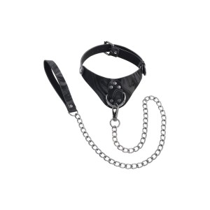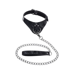 Add a touch of elegance to your BDSM play with this silver collar and matching chain, featuring faux..
