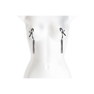 Melns metāla krūšu klipšu komplekts, katrs uz 20 cm garas metāla ķēdes, un piestiprināta klitora kli..